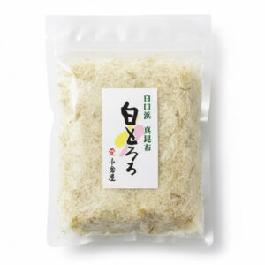 尾札部浜の天然まこんぶを材料にしたとろろ昆布です。糸状で長さがあります。お汁物に浮かべて食べたり、おにぎりに巻いたり、ちぎってご飯にふりかけたり。